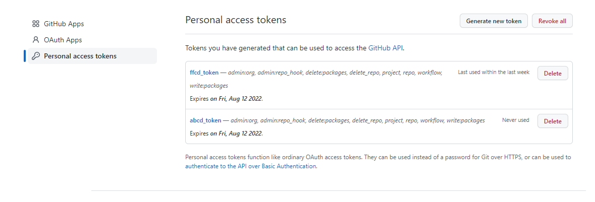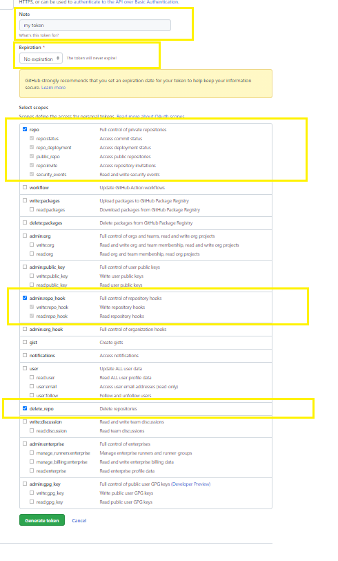 5.generate new token 누르고 note에 아무거나 적은 후 밑에 체크를 해줘야한다.